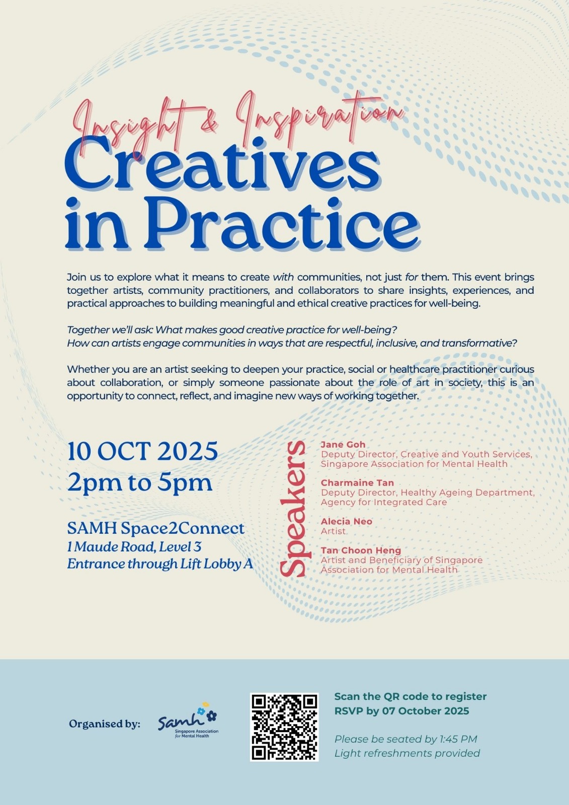 As part of the Arts and Wellness Community of Practice, we are delighted to invite you to our first Share & Learn session, organised by the Singapore Association for Mental Health (SAMH).